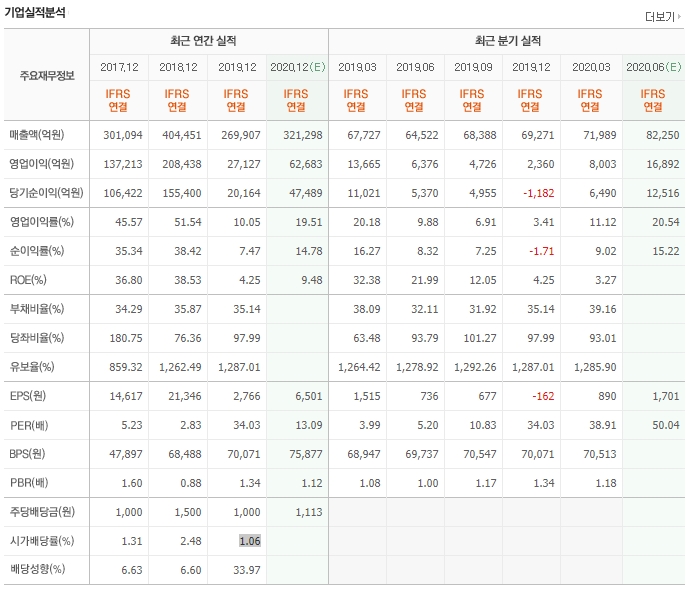 2020년 배당금 1113원 배당수익률 1.30%(예상)
